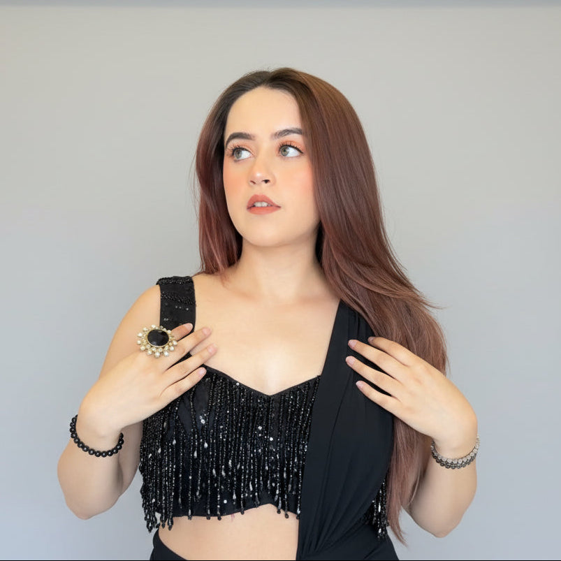Drape into elegance with this stunning black saree! The fabric flows like liquid, creating those gorgeous, effortless folds that make you feel like a Bollywood star. The blouse is an absolute showstopper. Intricate handwork adorns every inch, featuring delicate embroidery that catches light and turns heads. Perfect for wedding celebrations!
