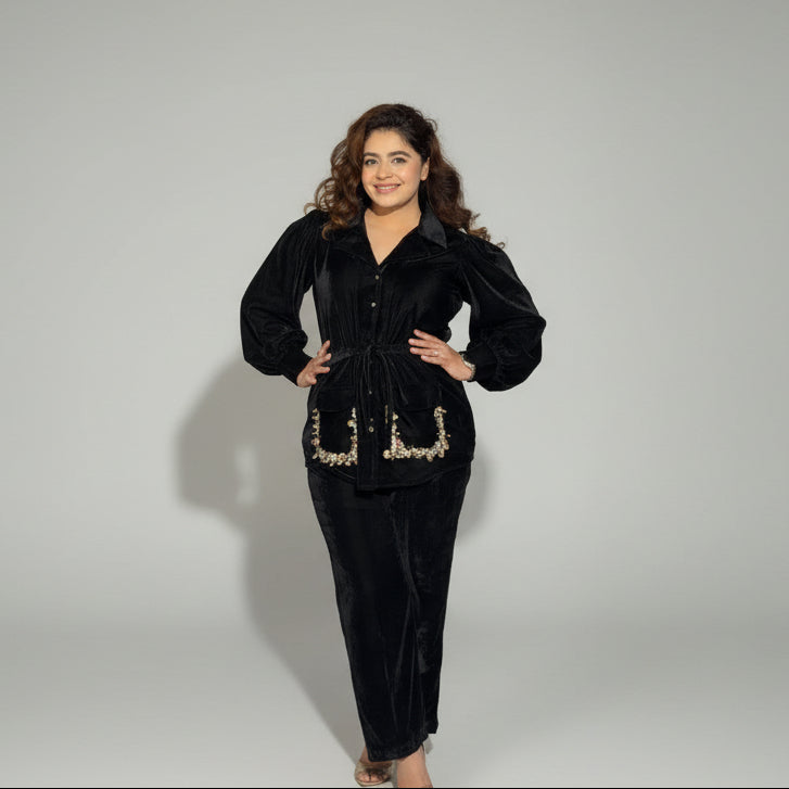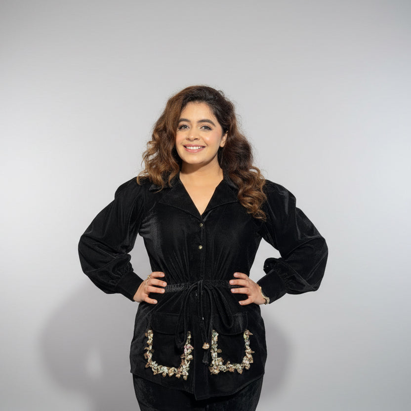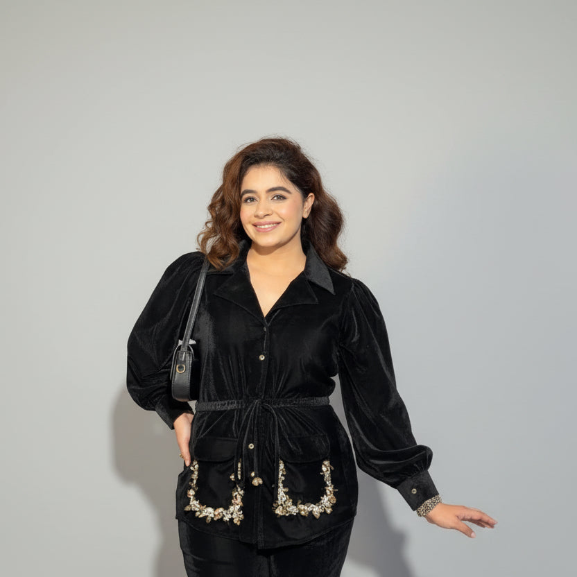 A beautiful black velvet coord set, inspired from our Sandstone Charm Shirt. Perfect for your winter gatherings. Doesn't only keep you warm but makes you look fashionable too.