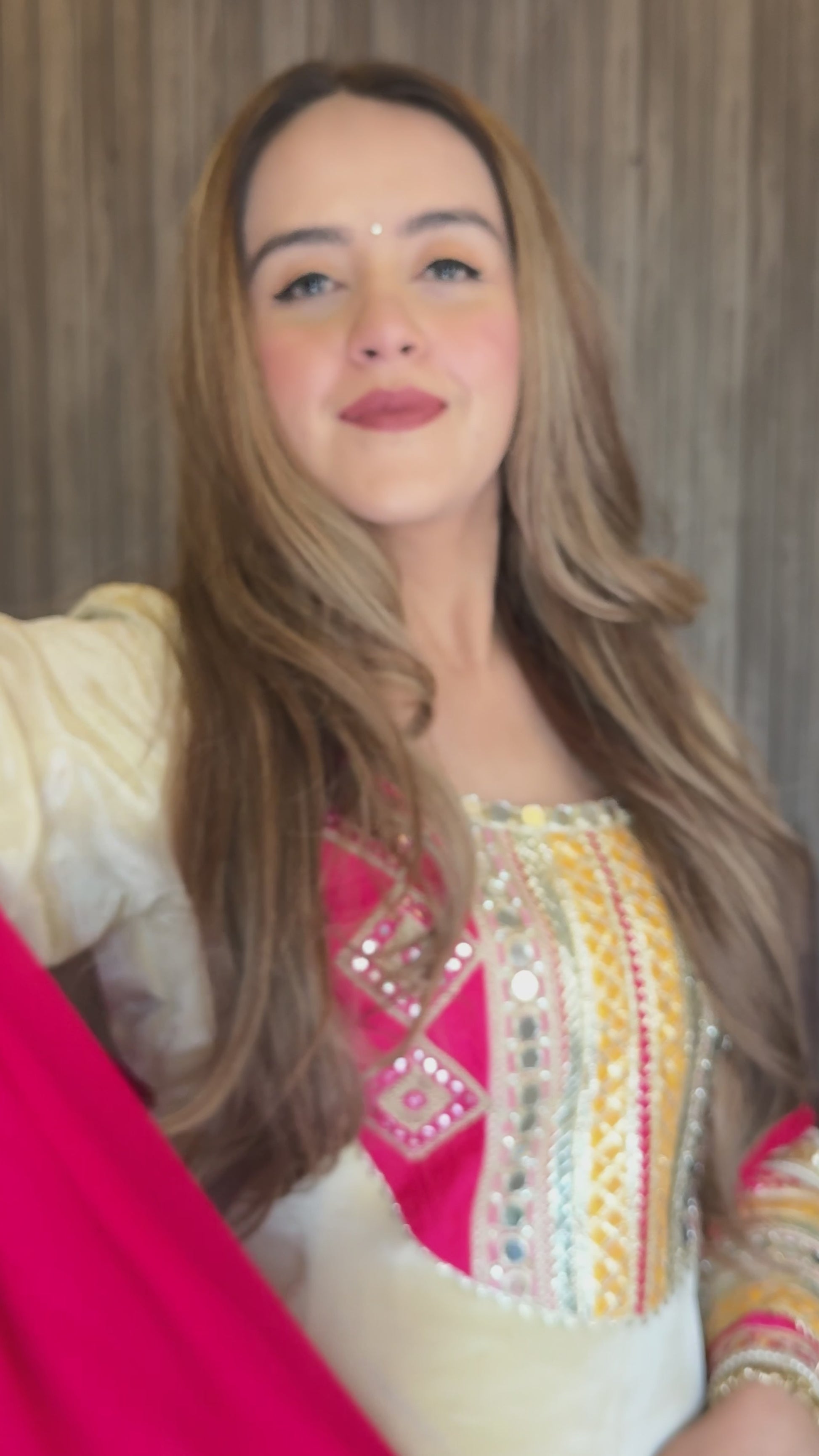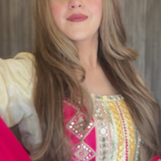 Luxurious shimmer silk suit with intricate mirror work. This elegant ensemble features shimmer silk fabric with beautiful borders and delicate mirror work, perfect for adding a touch of glamour to your festive look.
