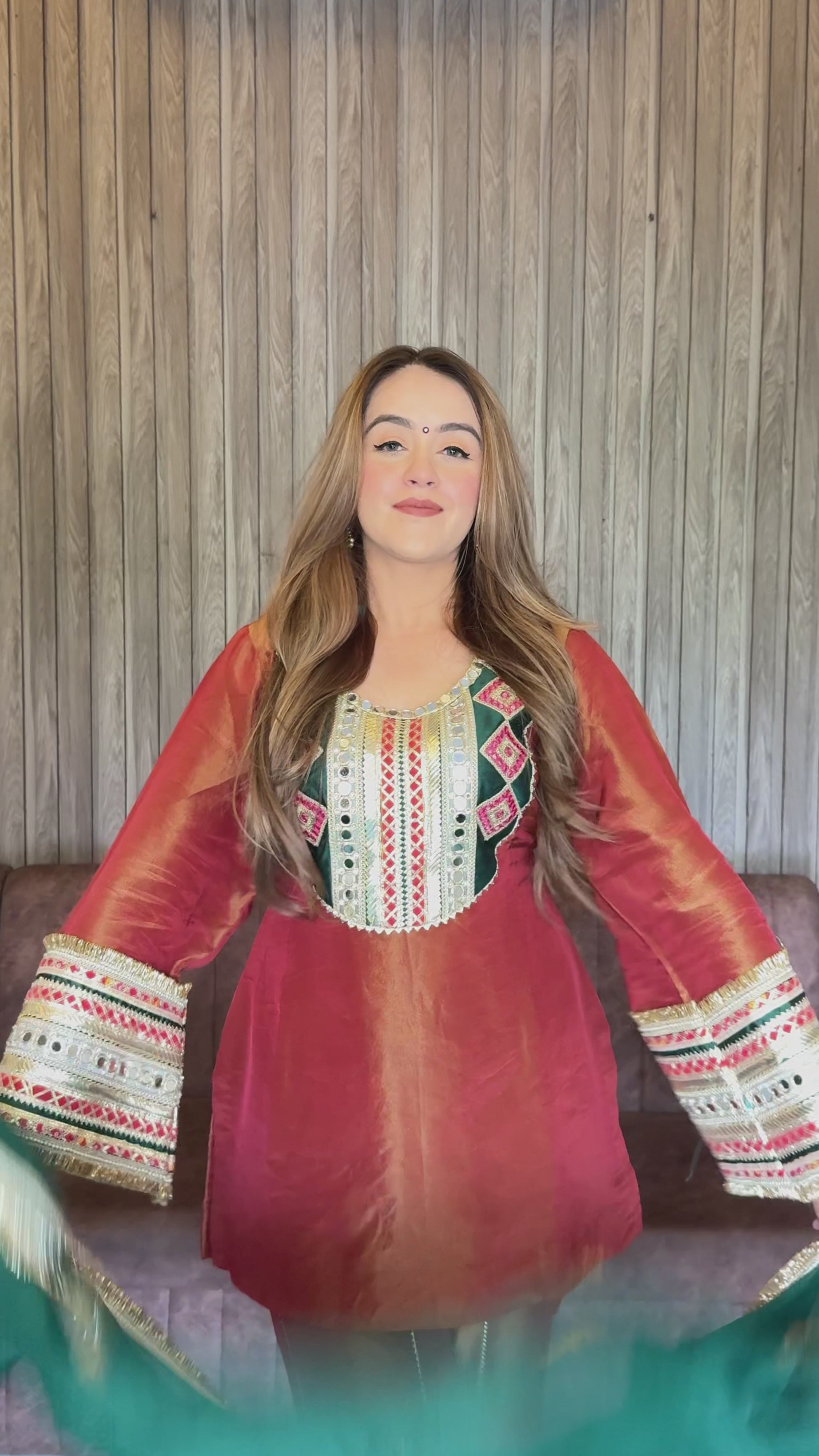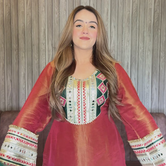 Luxurious shimmer silk suit with intricate mirror work. This elegant ensemble features shimmer silk fabric with beautiful borders and delicate mirror work, perfect for adding a touch of glamour to your festive look.