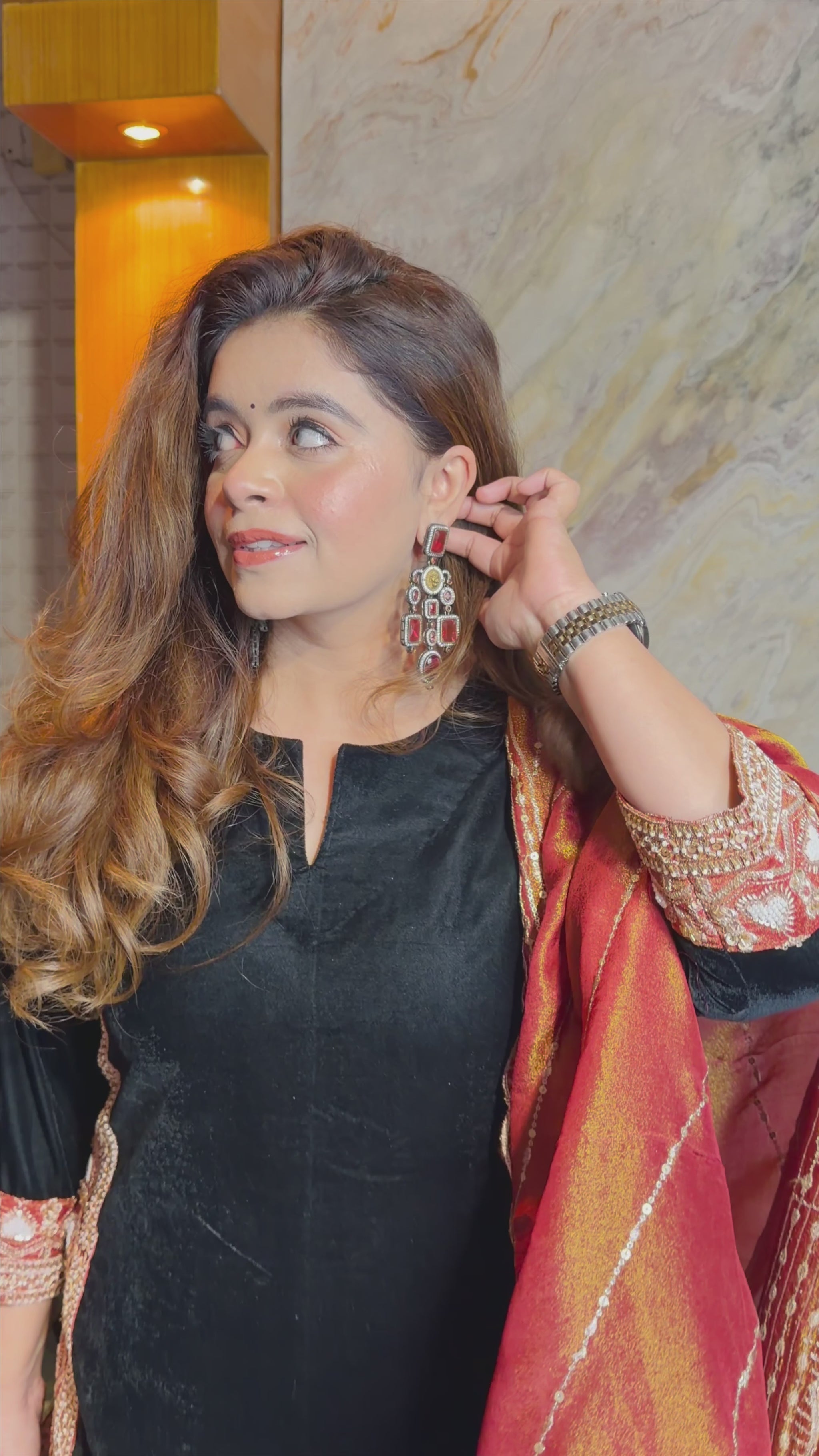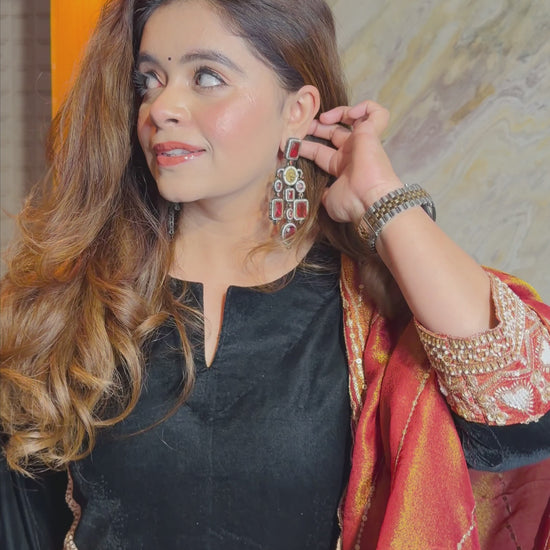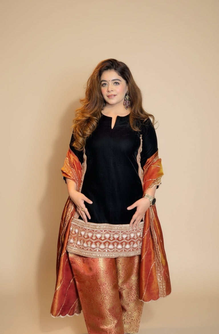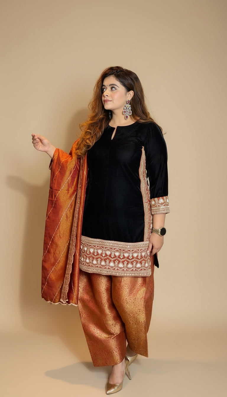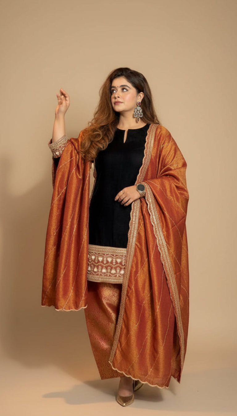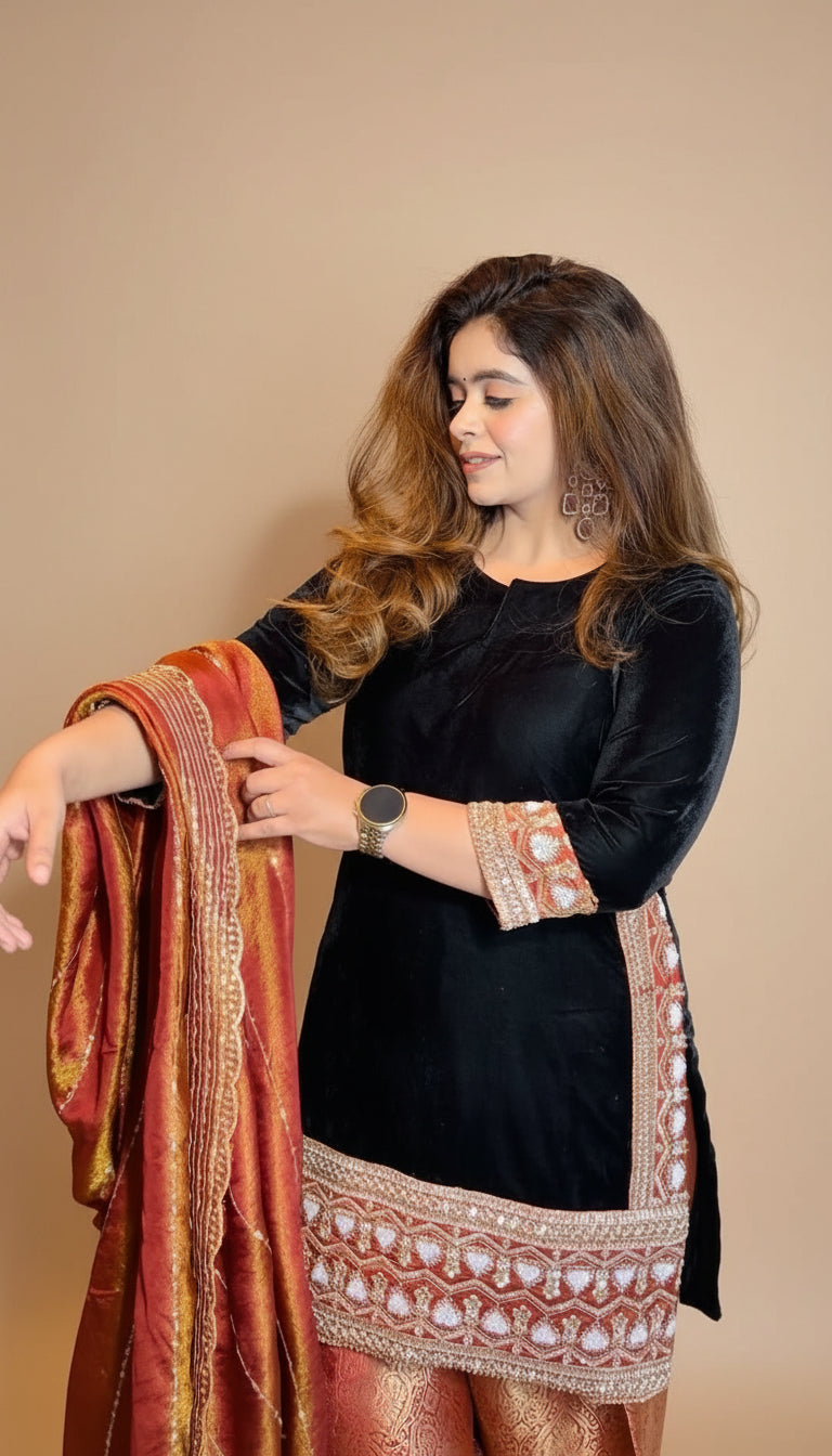 Elevate your festive wardrobe with this stunning rust velvet suit set. Designed for winter celebrations and wedding season. The hand-embroidered velvet shirt showcases intricate craftsmanship, while the Farshi salwar offers graceful movement and comfort. Complete the look with the gorgeous dupatta that adds that perfect finishing touch. Whether you're dancing at a mehendi or gracing a wedding function, this ensemble promises to turn heads and make you feel absolutely radiant. A timeless investment piece that blends traditional elegance with contemporary flair.