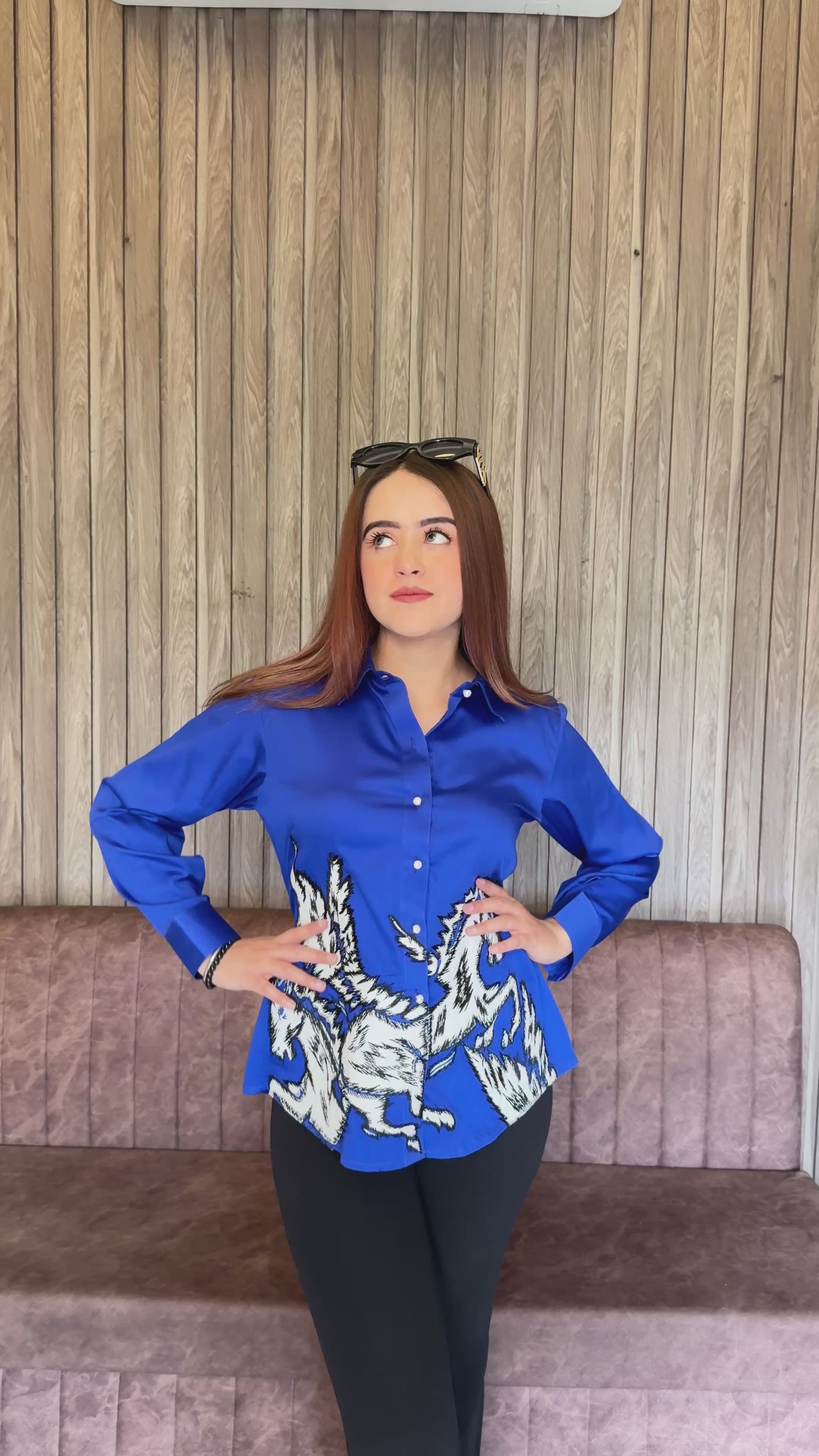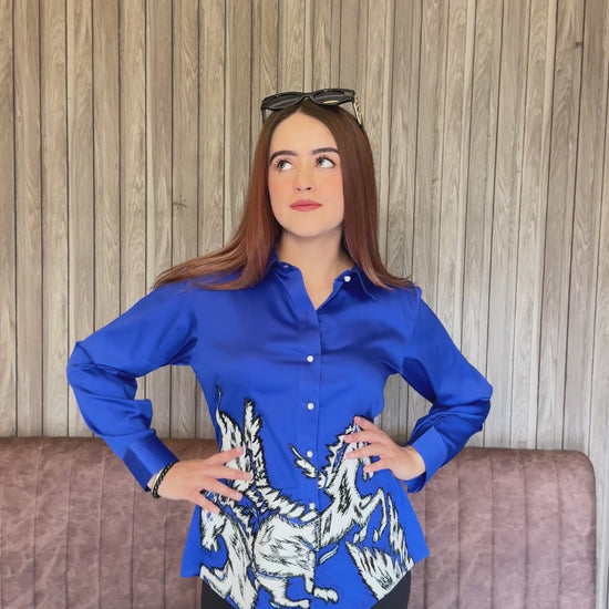 The Blue Horse Shirt showcases masterful embroidery work with intricate detailing that elevates everyday wear.
