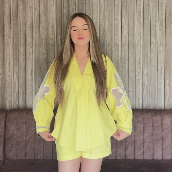 Brighten your wardrobe with this delightful butter yellow coord set! Crafted from premium cotton for all-day comfort, pairs a shirt with coordinating shorts. The magic lies in the exquisite handwork detailing on the sleeves. Perfect for casual outings, weekend getaways, or whenever you want to add a sunny splash of joy to your look.