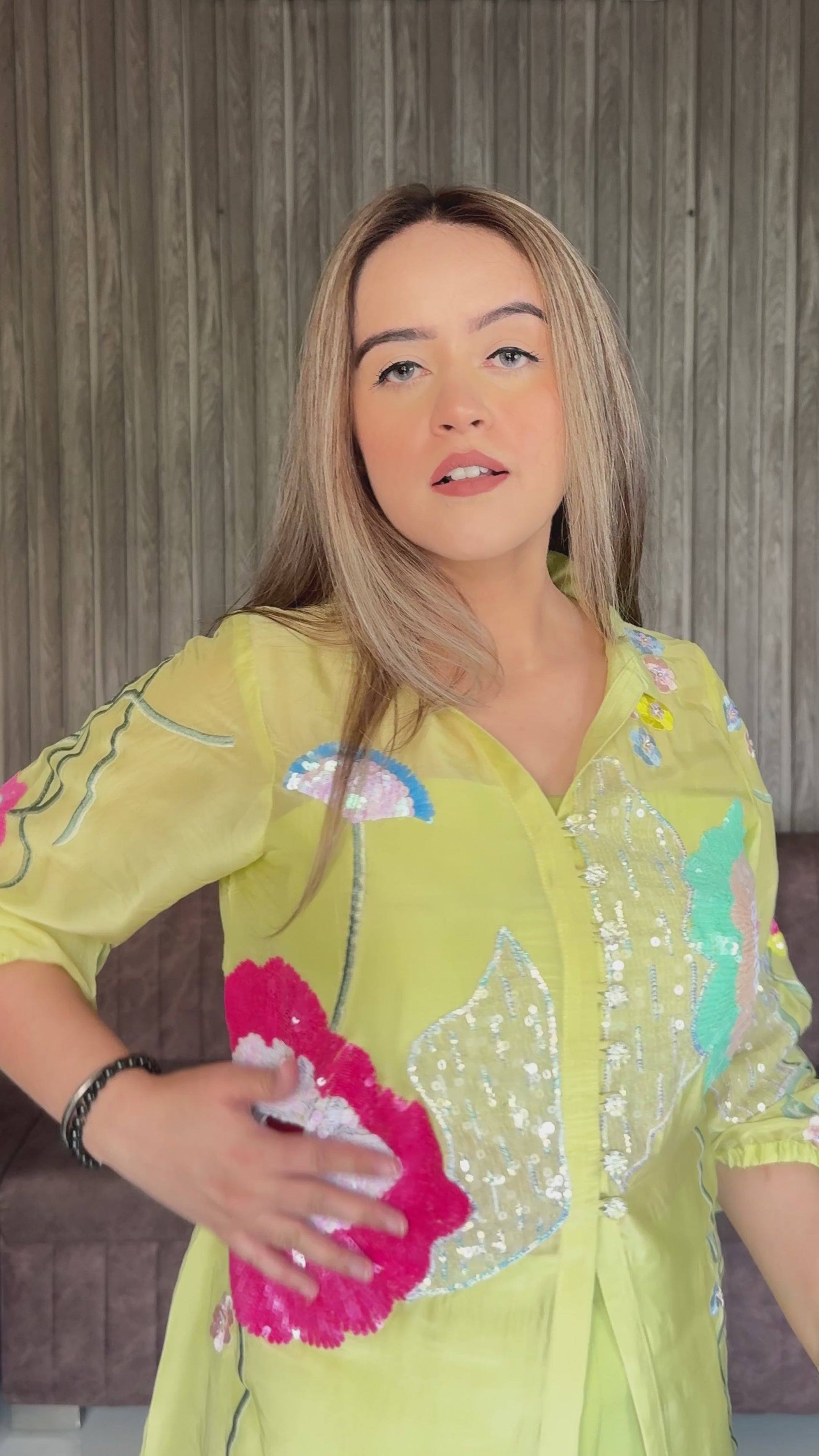 Elegant lime green 3 piece co-ord set with floral handwork embroideries. This stunning outfit features intricate flowers, cuffed sleeves, and matching pants/bustier.