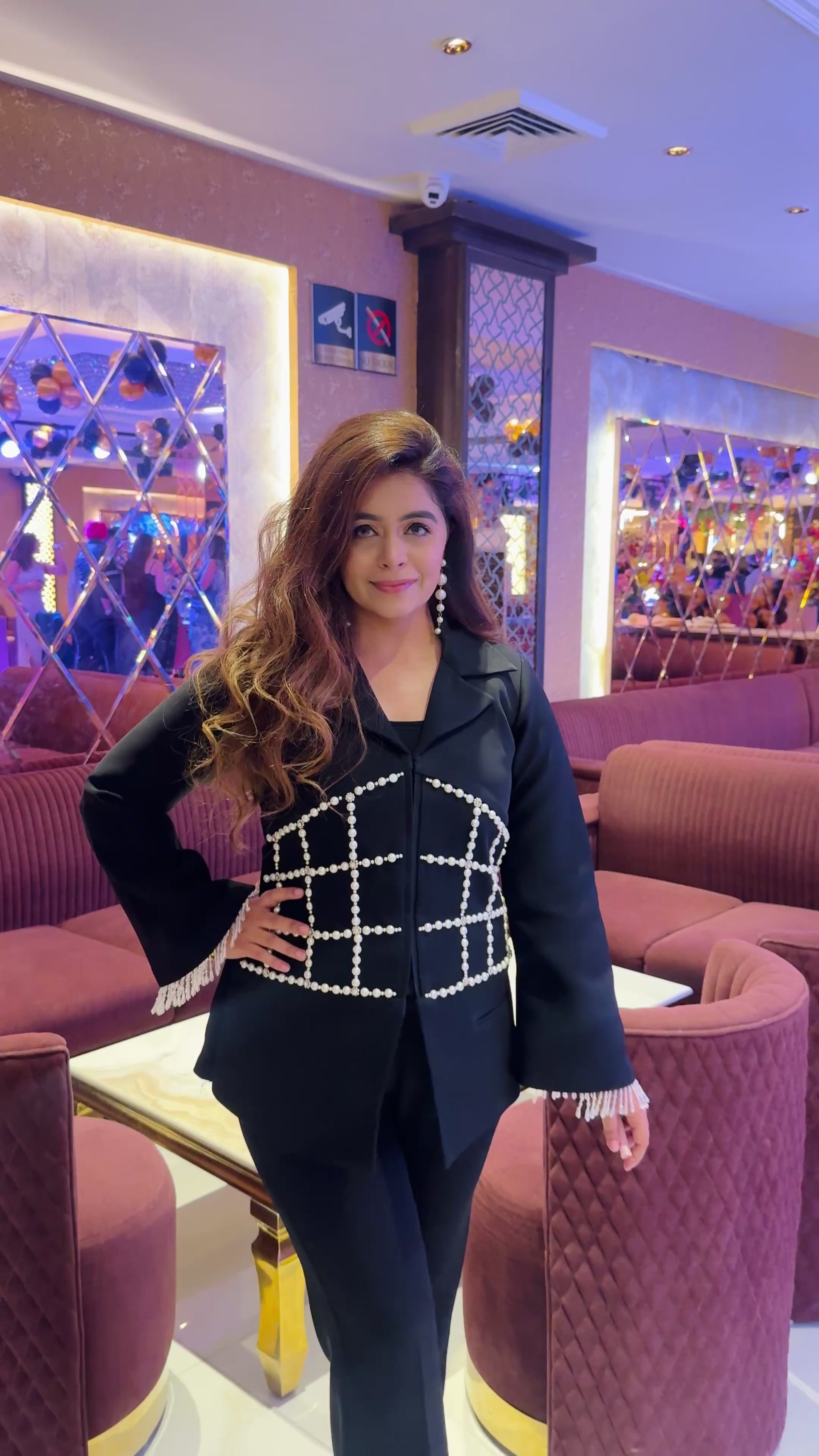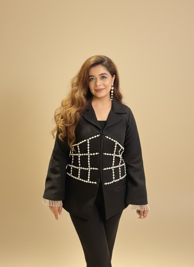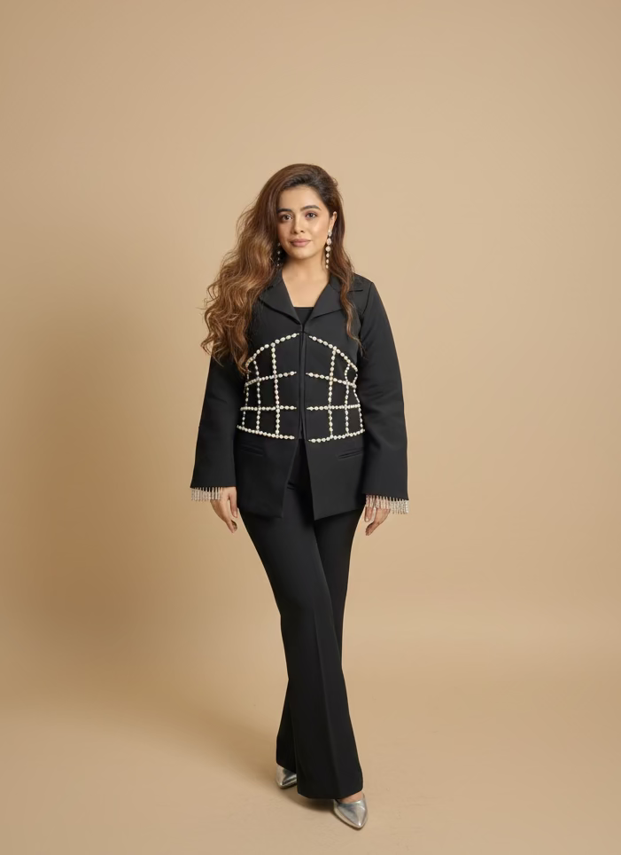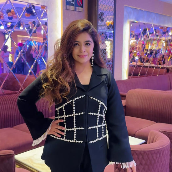 Formal black co-ord set adorned with intricate pearl detailing on the blazer. The pearl embellishments, arranged in a corset pattern, add a touch of sophistication. The overall design exudes a sense of refined glamour, making it suitable for formal occasions.