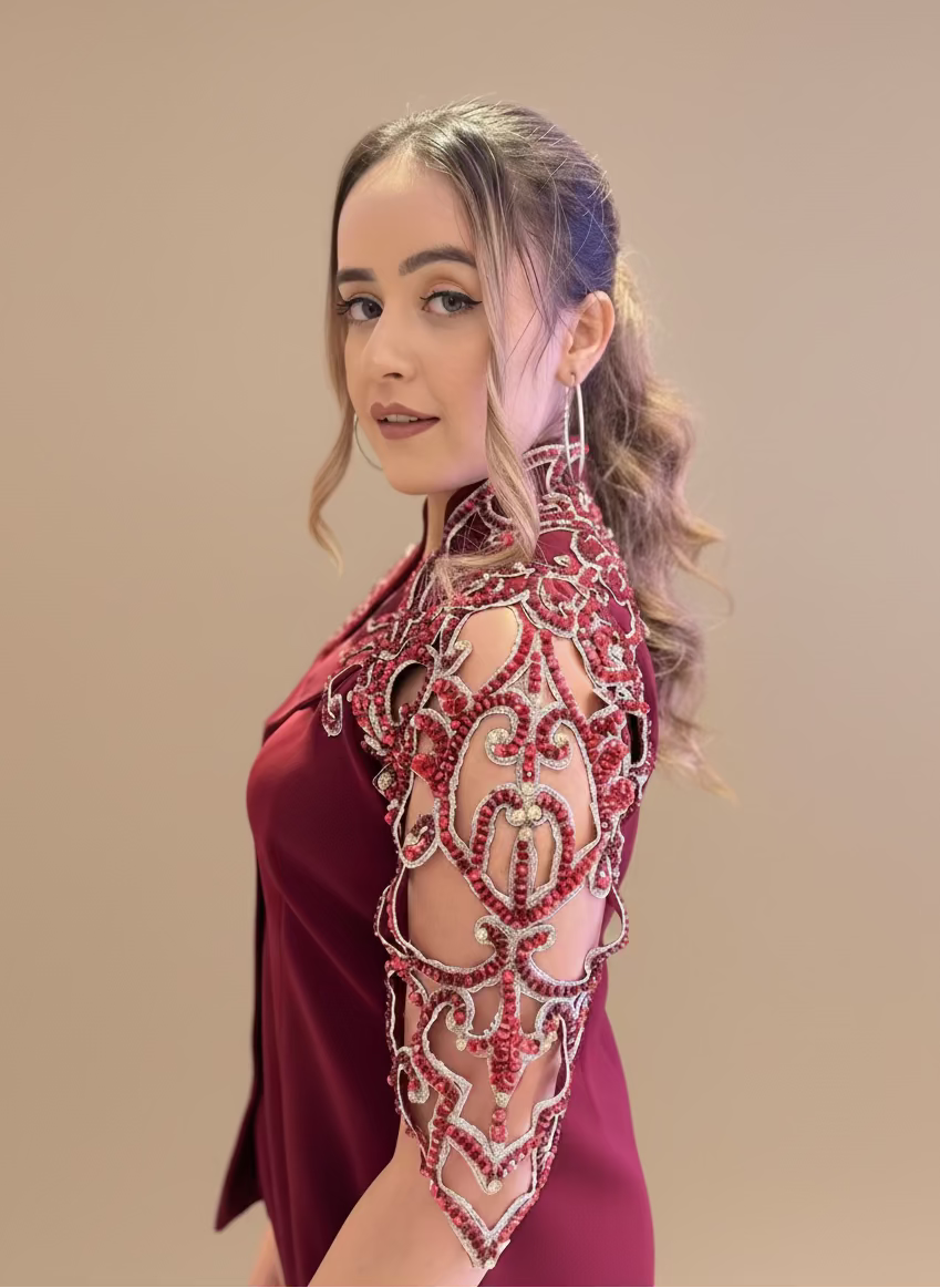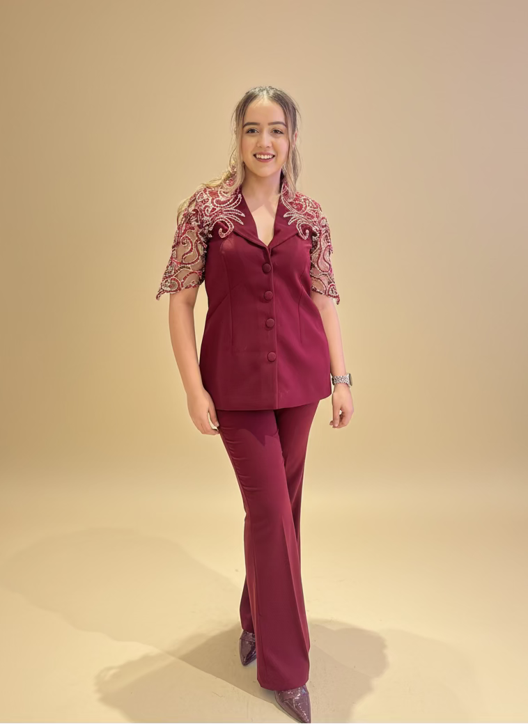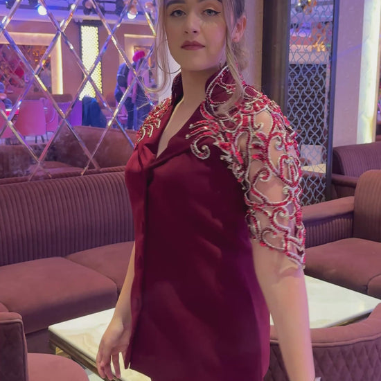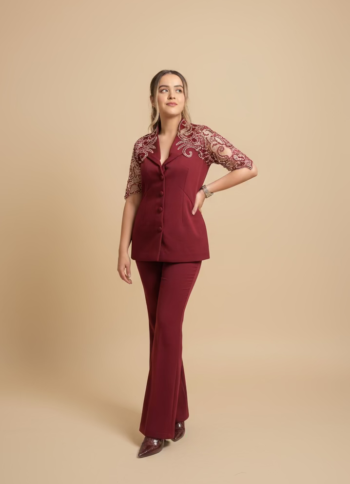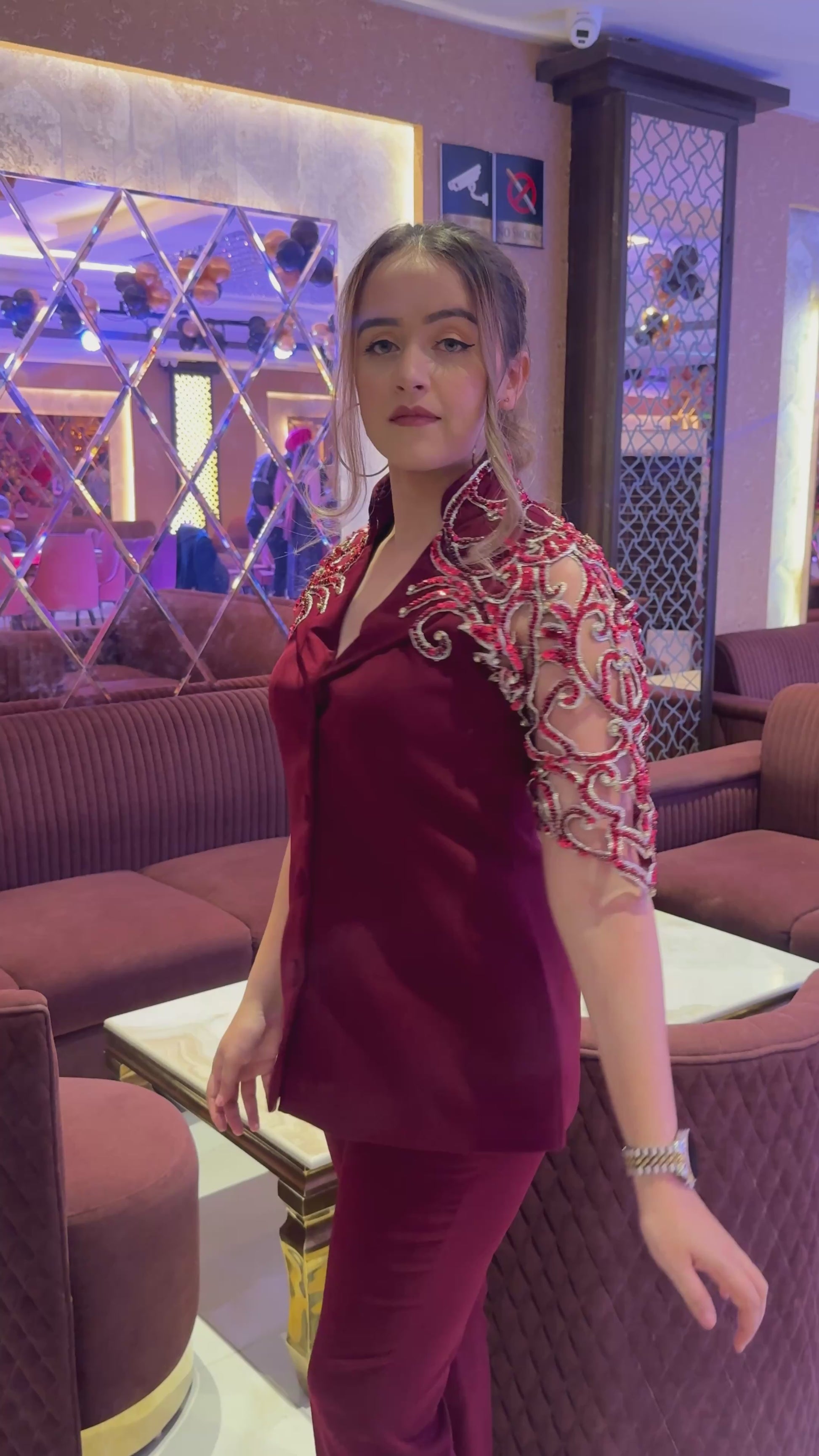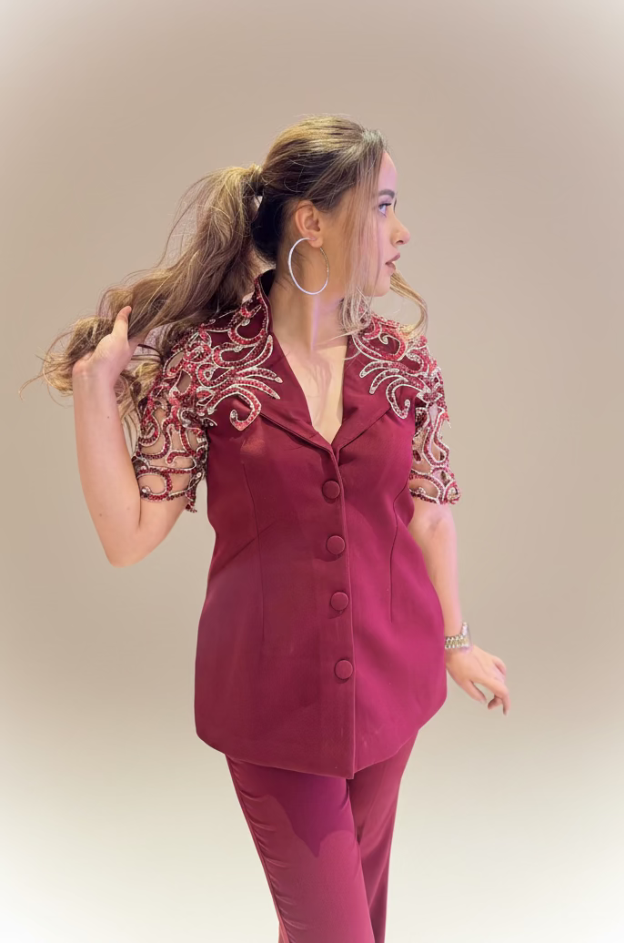A stunning wine co-ord set featuring intricate mehroon and silver handwork on the sleeve and shoulder, adding glamour and sophistication. Perfect for a chic evening out or special occasion.