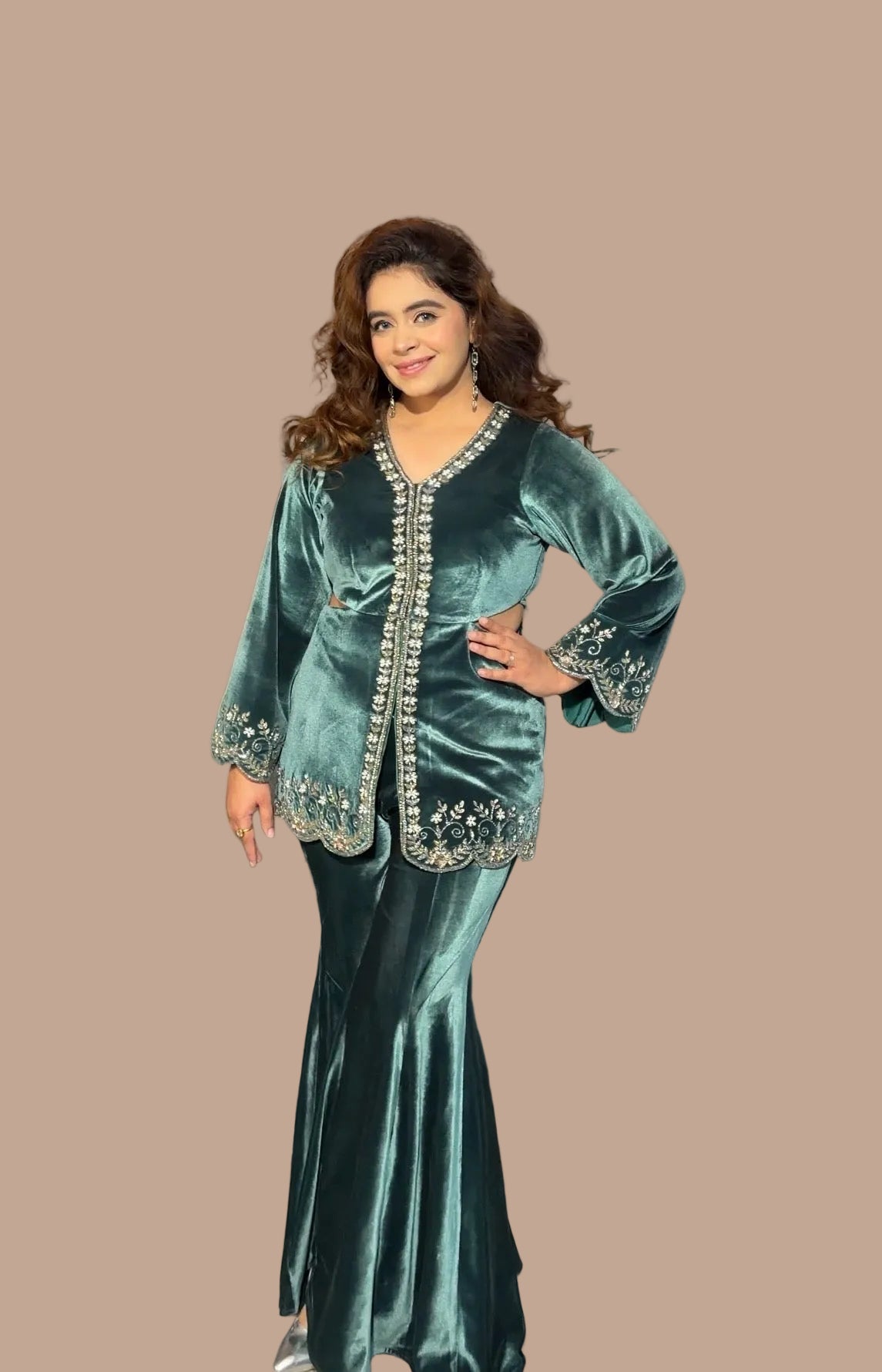 This luxurious velvet co-ord set features a short, tailored jacket with handwork embroidered details, paired with matching kali bottoms. The ensemble has a rich, glossy and an elegant, festive vibe perfect for party wear.